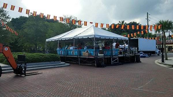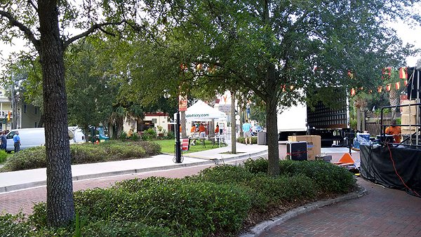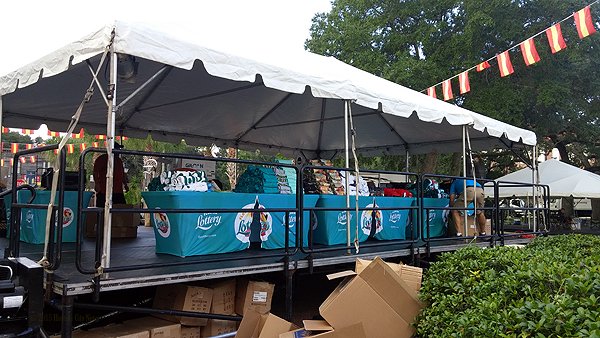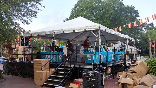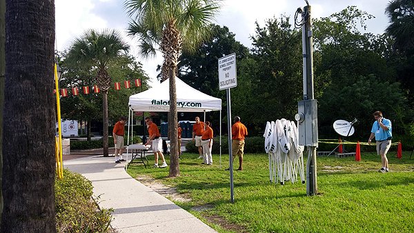 After breakfast, I headed over to the clock circle to identify three large stages that had been set up Friday but left vacant. An army of Lottery employees descended on the driveway where the tents were being assembled. They popped open a tractor-trailer in the parking lot, and began unloading case after case of logoed merchandise to be given away throughout the day, courtesy of the Florida Lottery.