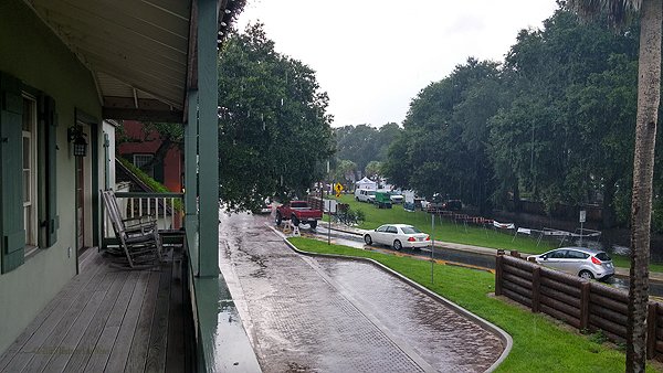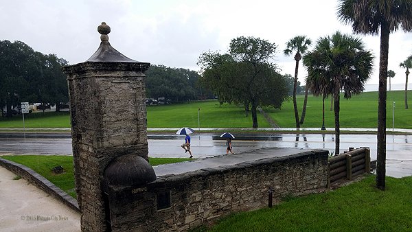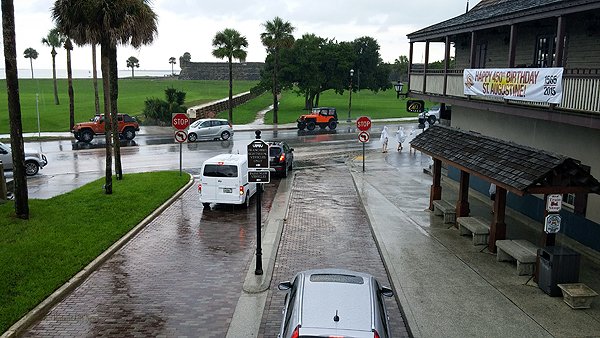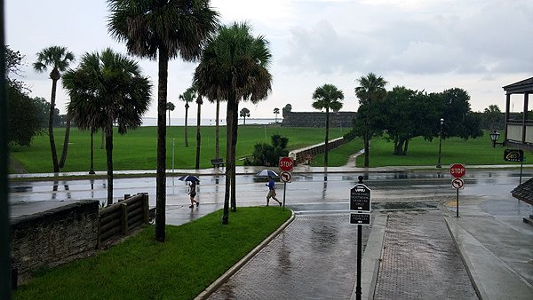 At 10:08 a.m. the first bright flash of lightening and clap of thunder, separated by no more than one or two seconds, signaled that the downpour was imminent. And, it was. A sheeting rain, interrupted by occasional recurrence of nature’s light show, sent what few people who had been milling around on a search for cover.