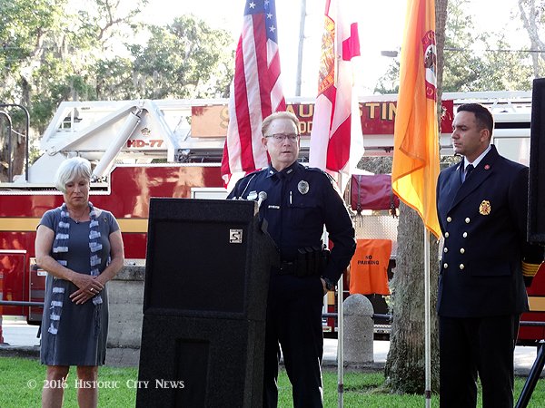 Mayor Nancy Shaver and newly appointed St. Augustine Fire Chief Carlos Aviles will offer remarks. The 15-minute program will include a presentation of the colors by the St. Augustine Police Department Honor Guard, with Officers Caroline Drouin and Roy Smith, an invocation by Mark Samson, St. Augustine Police Department Public Information Officer, and musical presentations by St. Augustine Fire Department Engineer Ed Purtill.
